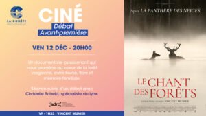 La projection sera suivie d’un échange avec Christelle Scheid, docteure en éthologie, spécialiste du lynx et responsable du programme de préservation du lynx dans le Parc des Vosges du Nord, afin de prolonger la réflexion autour de la place des forêts et de la biodiversité dans nos vies quotidiennes.
